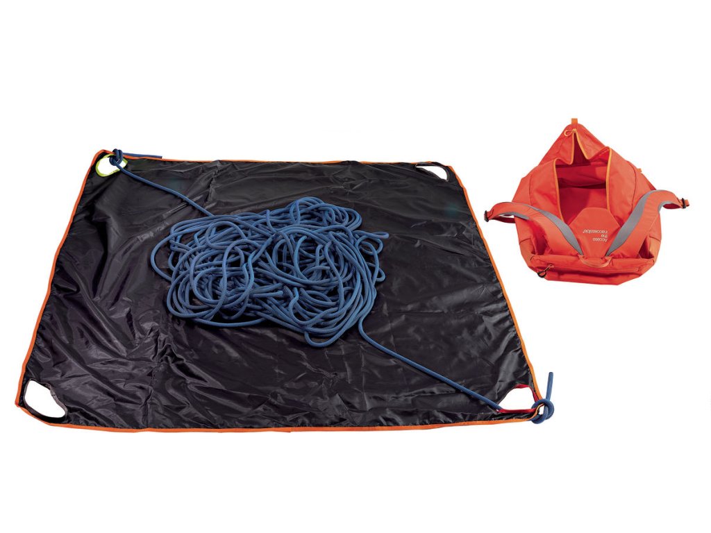 The large zippered back opening keeps the carrying side clean and gives quick access to all your equipment when the bag is on the ground. Inside, a removable 140 × 140 cm rope tarp provides a clean, designated space for your rope, with color-coded corner loops to help you keep track of rope ends.