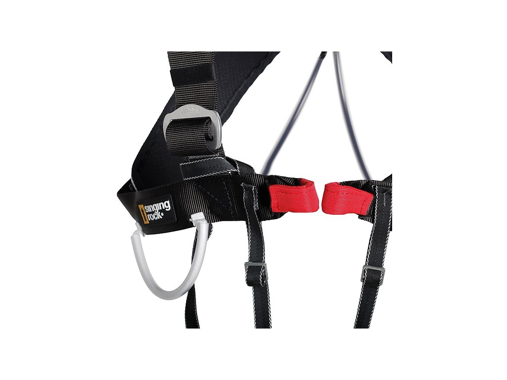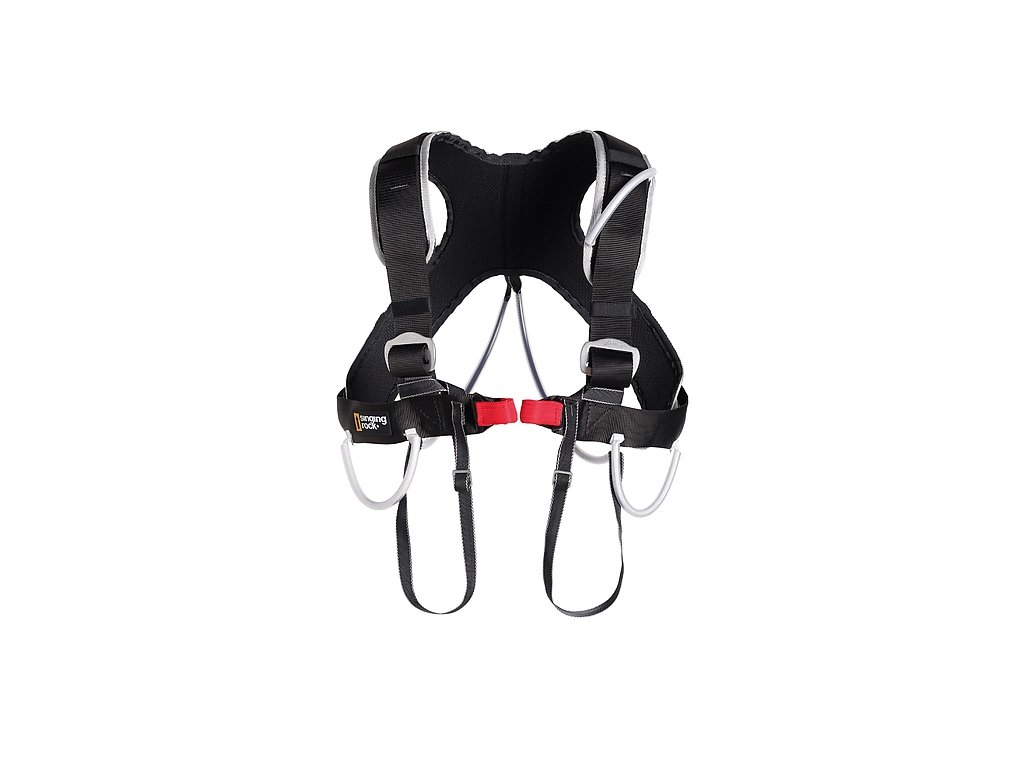 The Singing Rock Aladin Plus is a padded chest harness designed to be used only in combination with a sit harness. It helps keep the body in an upright and stable position when hanging or in the event of a fall — especially useful when carrying a heavy rack or backpack.