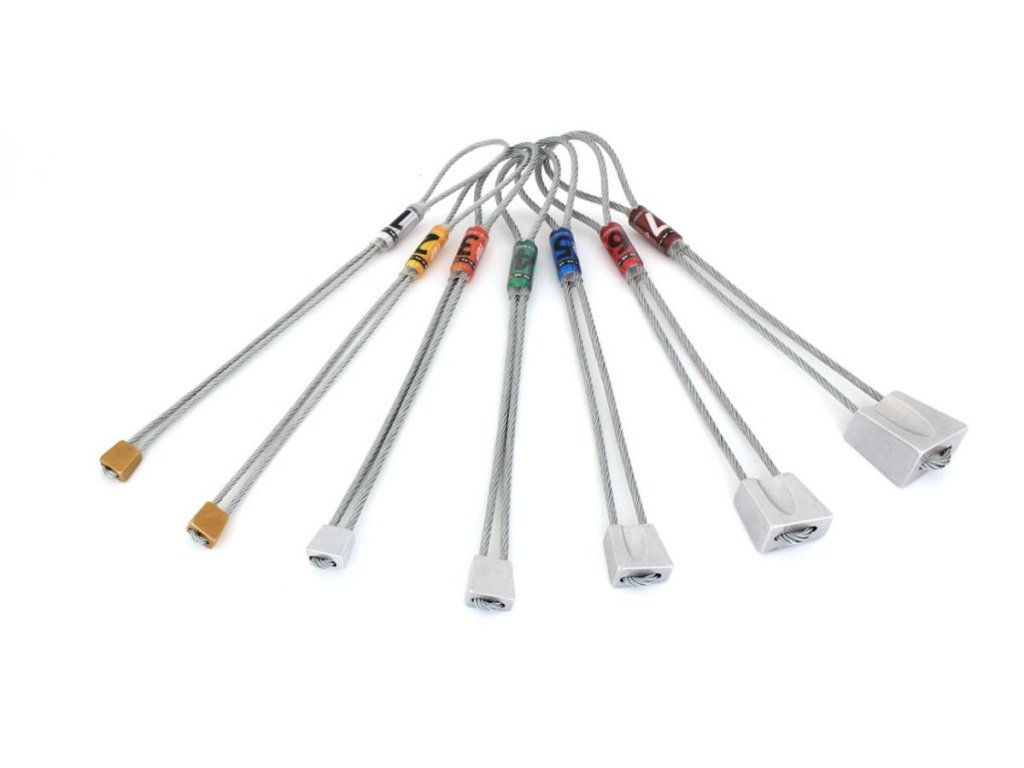 The smaller sizes (1–2) are made of high-quality brass, providing superior holding power in small and marginal placements, while the larger sizes (3–7) are made of lightweight, durable aluminum alloy for excellent strength without unnecessary weight. Every stopper is mounted on a strong steel cable, ensuring long-term durability and dependable performance.